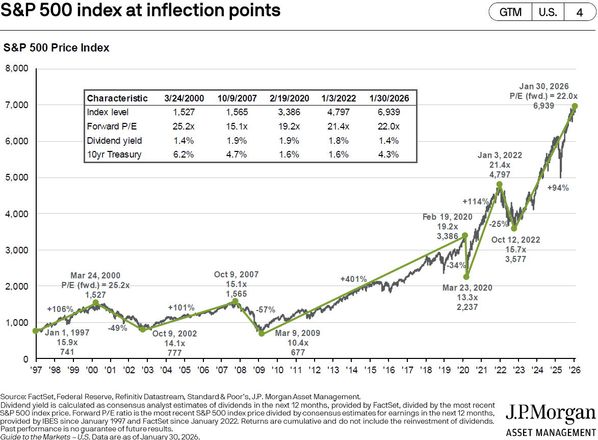 1 “S&P 500 index at inflection points,” Slide 4, Guide to the Markets, J.P. Morgan. Jan 31, 2026.